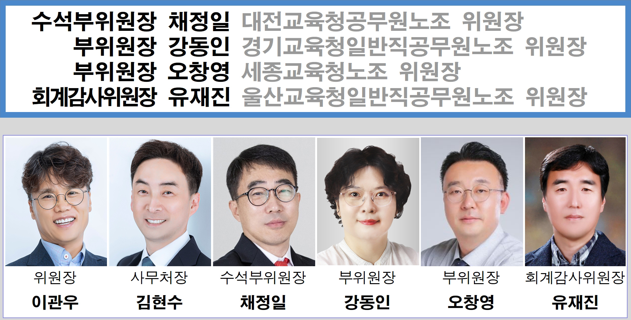 수석부위원장에는 채정일(대전광역시교육청공무원노동조합 위원장) 후보가, 부위원장에는 강동인(경기도교육청일반직공무원노동조합 위원장), 오창영(세종특별자치시교육청노동조합 위원장) 후보가 당선되었고, 회계감사위원장에는 유재진(울산광역시교육청일반직공무원노동조합 위원장) 후보가 당선의 영예를 안았습니다.