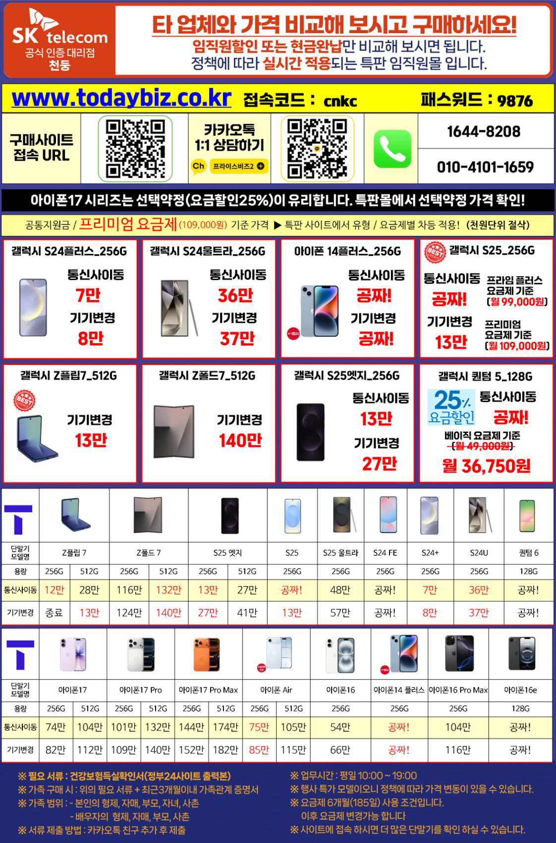 제목 : 【SKT특가】 Z플립 512 기변 13만 / S24플러스 8만 / 아이폰Air 55만할인(선택약정)